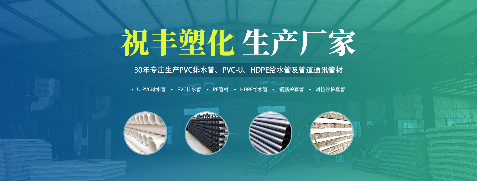 安陽(yáng)市祝豐塑化有限公司坐落在滑縣工業(yè)園區(qū),東臨大廣高速,西臨京珠高速,是鄭州、鶴壁、安陽(yáng)、濮陽(yáng)四個(gè)城市的輸紐,交通便利、環(huán)境優(yōu)美。 公司始建于八十年代,經(jīng)過(guò)二十余年的艱辛創(chuàng)業(yè),規(guī)模不斷壯大,由十多萬(wàn)元資產(chǎn)的小廠,發(fā)展到現(xiàn)占地面積達(dá)一萬(wàn)多平,建筑面積一萬(wàn)平,資產(chǎn)2000多萬(wàn)元管材生產(chǎn)企業(yè)。公司生產(chǎn)PVC-U、PVC排水管、HDPE給水管、鋼筋護(hù)套管管道通訊管材等產(chǎn)品,廣泛用于農(nóng)田節(jié)水、高山引水、人畜用水、建筑、電力通訊等多種用途,品種齊全。為了滿足用戶需求,可承攬各種給水、節(jié)水、灌溉工程?!白XS塑化”憑借強(qiáng)勁的實(shí)力,優(yōu)良的管理水平。“以質(zhì)量求生存,以信譽(yù)求發(fā)展”的原則全力以赴和大家共同塑造美好未來(lái)。..